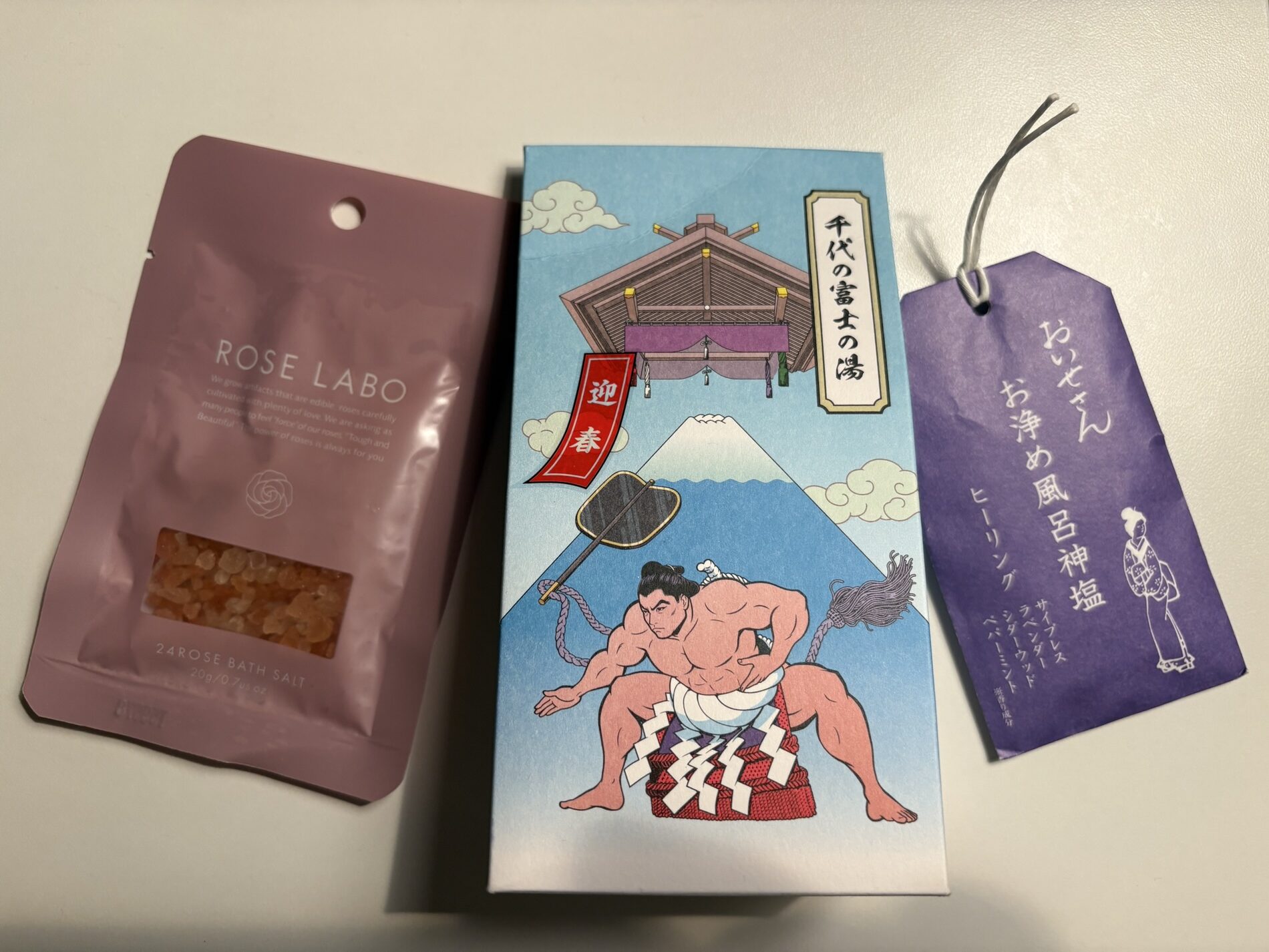 真ん中は千代の富士の湯という入浴剤。銭湯!温泉!というよりはハーブ系の香りが盛り込まれたアイテムのよう。3つ入って1300円ほどでした。