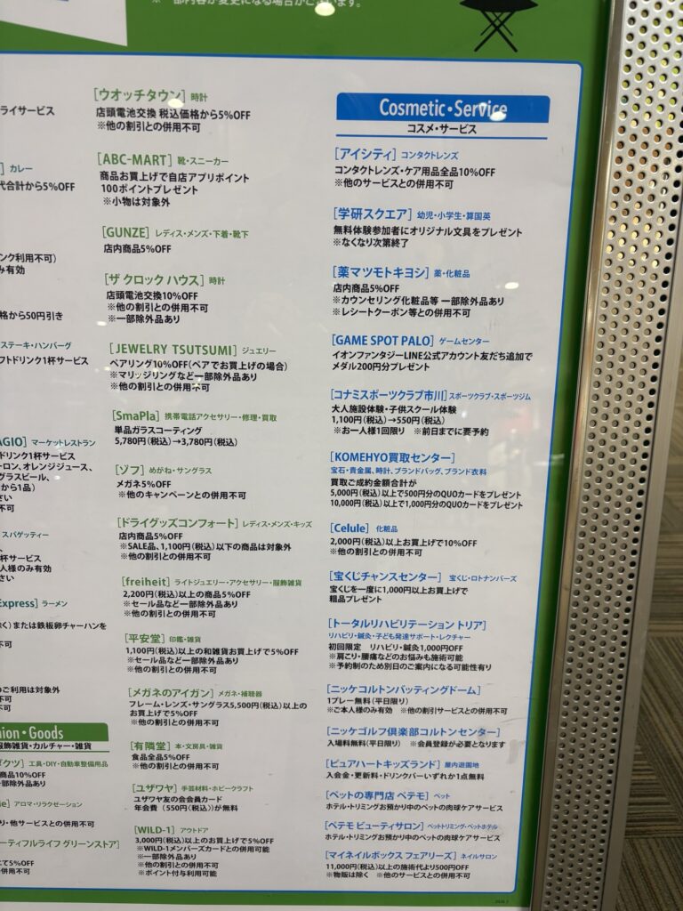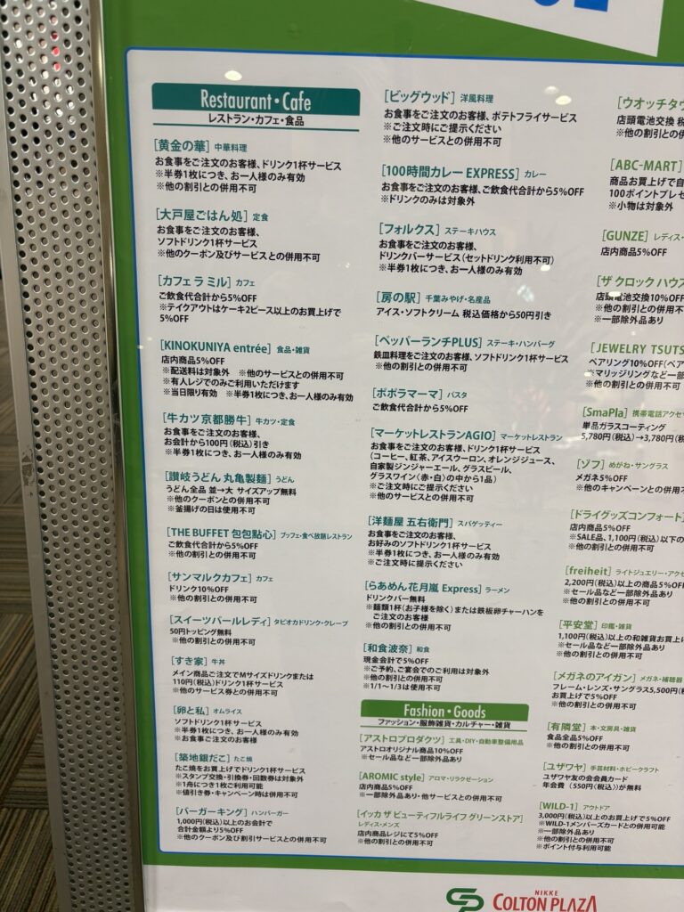 レストラン。カフェ、食品、ファッション雑貨、サービスなどかなり豊富なシネ得